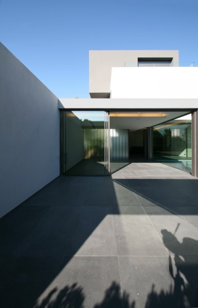 Η τριώροφη αυτή κατοικία έχει επιλέξει μια περίοπτη κατακόρυφη διάταξη από τρεις όγκους με μικρές οριζόντιες μεταθέσεις μεταξύ τους. Από αυτούς τους όγκους ο πρώτος, το ισόγειο, εκτείνεται κατά μήκος του οικοπέδου αποτελώντας στο μεγαλύτερο μήκος του την πλευρά μιας γραμμικής πισίνας. Σε αυτήν τη στάθμη η κατοικία αυτή διασφαλίζει την ιδιωτικότητα των πελατών από τους εισερχόμενους καλεσμένους με έναν τοίχο που εκτείνεται αριστερά και χωρίζει την πορεία εισόδου από τον χώρο καθιστικού και την υπαίθρια επιμήκη αυλή που βρίσκονται στην άλλη, προστατευμένη του πλευρά. Η αυλή αυτή προεκτείνεται ως πρόβολος προς την πρασιά. Στο ισόγειο οι χώροι διημέρευσης διατάσσονται σε μια ελεύθερη διάταξη έχοντας στο πλευρό τους το κλιμακοστάσιο το οποίο όντας σκούρο αποτελεί μια έντονη αντίθεση με το υπόλοιπο λευκό εσωτερικό. Τοπικά το κλιμακοστάσιο αυτό διαθέτει επιφάνειες από τζάμι.